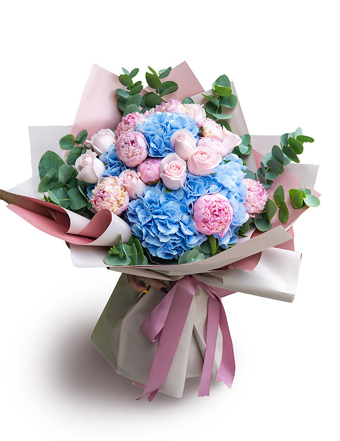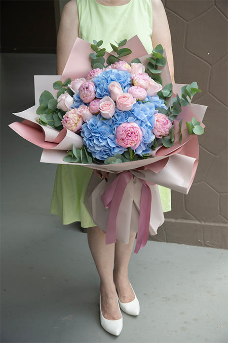 A gigantic bouquet of 5 sweet blue hydrangeas and 10 fabulous pink peonies with exotic greens arranged in a hand bouquet.